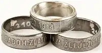 In October 1914, the Government Commissioner for the Organization of Voluntary War Nurse Service, with the approval of High Royal Government, started campaign Gold for Iron (Zlato za željezo) in order to gather "gifts in the form of golden items, cash money, and other valuables". After the assessment and with the written confirmation, donors were given an iron ring worth as the given donation, with the minimum value of the donation being 5 krones. The purpose of this charity campaign was to raise money for the families of killed soldiers "who are natives of these Kingdoms and who have left their families with lack of supplies." The center of the organization was in Zagreb, while collecting was carried out at the premises of the First Croatian Savings Bank on Ilica no. 5, in its subsidiaries or by an authorized person in the smaller towns. The rings had inscription "I Gave Gold for Iron 1914" and were protected by the stamp of the Commission for the Organization of Voluntary War Nurse Service.[24] In addition, in the year 1915, citizens of Zagreb could hammer a nail into the trunk of the lime tree at Nikola Šubić Zrinski Square for a symbolic amount of money, thus collecting resources for families of soldiers who were killed in the war.[25] This action took place in other Croatian cities as well; in Pula donors could hammer a nail into the lighthouse, and in Jastrebarsko in wooden hawk.