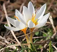 The common name of Crocus pestalozzae is "Ümraniye Çiğdemi". The plant naturally only spreads in Turkey. It's seen in the woods, in the bushes and in the meadows. It has been observed in Izmit and Gebze districts. Dark spots on the underside of the filaments are a characteristic feature of the species. There are 3 to 6 leaves, which are 0.5 to 1.5 mm wide. The throat of the perianth is yellow, glabrous or spicate; the section of the perianth is 1.5 to 2.5 cm long and 0.4 to 0.8 cm wide, blunt, or almost pointed, white or purple. The filament is 3 to 6 mm long, yellow in color and black at the base, and the head is 6 to 7 mm long and yellow. The neck is divided into 3 thin orange branches. Blooms in January, February, and March.[3] Tuber about 1.5 to 2.5 × 1.2 to 2.5 cm, tuber membranous or thin, brown, divided at base into horizontal tissue rings (divided). Leaves 3–6, sinandust, about 10 to 28 cm × 1.0 to 1.5 mm. They are vertical, green and have a distinct white midline. The leaves consist of two long lateral arms and a rectangular spine in the middle. The arms are bent in the direction of the spine. The flowers are white, rarely with violet-blue ends. Ecology, distribution, and recommended conservation measures: Grows in moist meadows at 700 m elevation.[4]