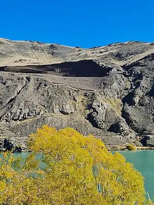 The Cromwell Gorge is dominated by the characteristic rocky tors and craggy outcrops of the Haast Schist Group; grey quartzofeldspathic metagreywacke interlayered with micaceous meta-argillite and greenschist formed during the Rangitata Orogeny.[5] The schist in Central Otago has a well-defined pervasive schistosity, with shallow dips defining the broad regional-scale warps in schistosity caused during Miocene deformation (the Kaikoura orogeny).[6] The warped geometries are antiformal over mountain ranges and synformal under the intervening basins.[7] Associated reverse faulting (the Otago fault system) along the south-eastern flanks of many Central Otago mountain ranges[8][9][10] (i.e. Taieri Ridge, Lammermoor Range, Rock and Pillar Range, Rough Ridge, Raggedy Range, Dunstan Mountains, Pisa Range) gives rise to the basin and range topography of parallel ridges and basins with steep south-eastern limbs and gently-dipping north-western flanks.[11]