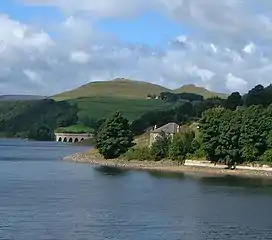 The hill is situated above the A57 Snake Pass road between Sheffield and Manchester as it passes Ladybower Reservoir. Crook Hill is regarded as an outlier of Kinder Scout although the two are separated by the long western arm of Ladybower Reservoir. The hill has twin summits, the highest of which reaches a modest height of 382 metres (1,253 ft) while the secondary top (sometimes referred to as Ladycrook Hill, although this name does not appear on Ordnance Survey maps) attains an altitude of 374 metres (1,227 ft). Geologically, the hill consists of Kinder Scout Grit, a kind of sandstone.[1] Both the hill's summits give excellent views of the surrounding countryside with Ladybower Reservoir, Derwent Edge and Win Hill being the main attractions. Between the two summits there is some evidence of an ancient megalithic standing stone circle. The circle originally consisted of five stones around a surviving mound of which only two are still upright.[2]