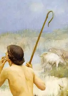 A shepherd's crook is a long and sturdy stick with a hook at one end, often with the point flared outwards, used by a shepherd to manage and sometimes catch sheep. In addition, the crook may aid in defending against attack by predators. When traversing rough terrain, a crook is an aid to balance. Shepherds may also use the long implement to part thick undergrowth (for example at the edge of a drovers' road) when searching for lost sheep or potential predators.
