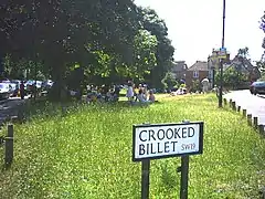 Crooked Billet is a small corner of Wimbledon Common with a green, housing mainly in the form of houses, and two public houses.[2][3] Contrasting with adjoining developed environs, it has maintained its core "identity as a semi-rural enclave". Formerly, it encompassed grazing land, cottages and farm buildings; surviving parts hark back to at least the 17th century. Currently, the public houses host various events, and the Wimbledon Morrismen perform there. A 1617 survey calls it "Shepherd's Hatch Gate" which refers to gates for grazing livestock.[1] A cottage was occupied by Richard Atkins who cultivated one of the fields south of the Ridgway.[1][4]