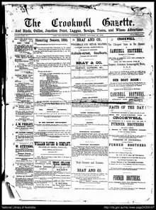 The first edition of the paper was circulated on 3 October 1885 by proprietor W. H. Oram.[5] Robert Howland took over as proprietor in 1890, a position he held until his death in 1902. His son Robert A. Howland was manager and editor.[6] The paper was subsequently published by Robert John Winning, who also owned the Taralga Echo.[7] Following the death of Robert Winning on 6 December 1933, his son John Robert Winning took over as publisher.[8] In December 1949 the Bradley family assisted Jim Woods to buy the paper from Winning. From 1965 the paper was leased by the Bradley/Woods partnership to Brian Dennis until 1983 when printing and production was transferred to The Queanbeyan Age. On 31 December 1995 the paper was sold to Rural Press Ltd.[9] In December 2006, Fairfax Media announced a takeover of Rural Press.[10] As December 2018, the Crookwell Gazette is published both in print and online by Australian Community Media.