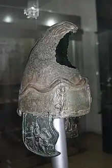 The Crosby Garrett helmet is an almost complete example of a two-piece Roman cavalry helmet. The visor portrays the face of a youthful, clean-shaven male with curly hair. The headpiece is in the shape of a Phrygian cap, on the crest of which is a winged griffin that stands with one raised foot resting on an amphora. The visor was originally attached to the headpiece by means of a hinge; the iron hinge pin has not survived, but its existence has been inferred from the presence of powdery deposits of iron oxide residue. The helmet would have been held in place using a leather strap attached from the wearer's neck to a decorated rivet on either side of the helmet, below the ear. Wear marks caused by opening and closing the visor are still visible, and at some point the helmet was repaired using a bronze sheet which was riveted across two splits.[2] Only two other Roman helmets complete with visors have been found in Britain: the Newstead Helmet and Ribchester Helmet.[3]