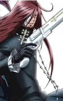 While finding Cross initially hard to design based on his long hair, Hoshino finds his facial expressions easier to draw. A major difficulty in illustrating Cross comes from how the ends of hair curl up. Shedraw those curls by turning her wrist. As Cross' fate after being attacked was remained ambiguous, Hoshino stated a young Cross would appear in the future, once the truth about Noah Nea is revealed. Despite also noting the poor treatment Cross gives to Allen, Hoshino states Cross cares for his student, most notably whenever Allen misbehaves.[2] Cross was voiced by Hiroki Tōchi in Japanese.[3] Due to Cross appearing early in the series only in the form as flashbacks of Allen, Tōchi only worked with this area of the series. As a result, he wanted the first anime to expand in order to further portray his character once he made his introduction.[4] He is voiced by Christopher Sabat in English.