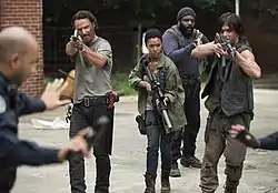 ![]() Rick, Sasha, Tyreese Williams, and Daryl take police officers of Grady Memorial Hospital as hostages. | |