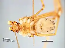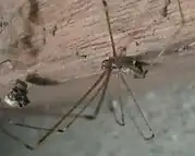 Crossopriza lyoni are classified under the genus Crossopriza and the subfamily Holocneminae. They belong to the cellar spider family (Pholcidae).[2] They are commonly referred to as tailed daddy longlegs spiders, tailed cellar spiders, or (more rarely) box spiders. C. lyoni and other cellar spiders are also often confused with two other invertebrates - the harvestmen (order Opiliones) and the crane flies (family Tipulidae) - both of which are also known as 'daddy longlegs'. However, they are not closely related to cellar spiders — the latter is a fly; and the former, while also an arachnid, is not a spider at all.[5][6]
