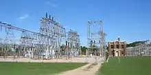 The transformers and switching equipment were removed from the generator building in 1930, when a separate switchyard/substation went into service to the west of the spillway.[14] Shortly thereafter, in 1931, Croton and Rogers dams were joined by the Hardy Dam, situated between them. The Hardy was the last major hydroelectric project constructed in Michigan by Consumers Energy.[7] Once completed, the 40-foot (12 m)-high dam would later impound 7.2 billion U.S. gallons (6 billion imp. gal/27 billion L) of water in its 1,209-acre (489 ha) reservoir and is capable of producing 8850 kilowatts at peak outflow.[5][6]