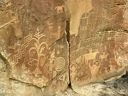 Hundreds of images representing animals, plants, corn, bow and arrows, spears, warriors, hunting scenes, supernatural beings, and representations of traditional Navajo art can be found on the 44 panels. A number of petroglyphs are believed to depict images of every day Navajo life, as well as images that are representative of the Navajo creation story and religious and spiritual ceremonies. Among the images are found, two male Shaman or deities. One deity is depicted with feathers on his back, horns, and a staff and the other is wearing a headdress with bow and a rattle in his hands. What is believed to be a female deity is also represented, its style being a more traditional Navajo geometric image.[1] Buffalo and elk impaled by arrows and corn stalks growing out of rain clouds symbolize the hunt and the central importance of corn in the lives of the Navajo people, both symbolic of a hunter-gatherer culture. A number of petroglyphs are thought to depict everyday life of the Navajo among images connected to the Navajo creation story and religious or spiritual ceremonies.
