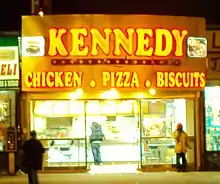 Kennedy Fried Chicken, Crown Fried Chicken, and Royal Fried Chicken are common restaurant names primarily in the New YorkNew Jersey, Philadelphia, Delaware and Baltimore areas of the United States, but also in nearby smaller cities or towns along the Northeastern United States. Kennedy Fried Chickens typically compete with Kentucky Fried Chicken (KFC) in the inner city neighborhoods of several states along the East Coast. There are also a number on the West Coast, primarily in California. A number of these restaurants, located in other states, are named New York Fried Chicken, essentially designed in the same manner and offering the same general menu as Kennedy, Crown, and Royal Fried Chicken. It is not an actual franchise in the typical manner; every "Kennedy" named chicken restaurant is independently owned and operated by different individuals but consist of essentially the same menu.