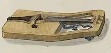 ...The rotta represents the first step in the evolution of the cithara, when arms and cross-bar were replaced by a frame joined to the body, the strings being usually restricted to eight or less...The next step was the addition of a finger-board and the consequent reduction of the strings to three or four, since each string was now capable of producing several notes...As soon as the neck was added to the guitar-shaped body, the instrument ceased to be a rotta and became a guitar (q.v.), or a guitar-fiddle (q.v.) if played with the bow."[8]