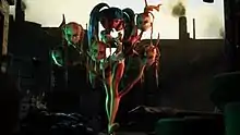 A flashback shows Ashnikko, this time with no mutations, floating inside the head of a mecha in space, starting to cry when she sees her pendant, which has the other half of the broken heart. In a dark forest, Grimes, who is depicted as a group of identical fairies, shoots a beam of light into the sky, which hits the mecha, causing it to explode. Ashnikko starts floating in outer space, before Grimes taps her head, causing her to morph into her distorted, three-headed version. Back in the city, Ashnikko walks towards the green-haired girl and begins to mutate as Grimes's heads start to grow out of her limbs.[27][28][5]