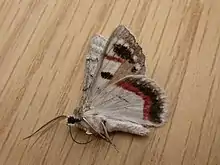It is one of the most common moths found in Australia. The "red-lined" part of the name refers to the red markings seen on the undersides of the wings. The moth has a wingspan of 4-5cm.[3][4] Both sexes of the moth are similar in appearance.[3] When threatened the grub stands still, pretending to be a stick.[5]