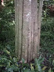 The bark is grey and somewhat corky on small trees, or greyish brown and scaly on larger trees. The trunk is often irregular or fluted in shape.