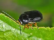 Cryptocephalus flavipes can reach a length of 3–5.5 millimetres (0.12–0.22 in).[2] Females are bigger than males. The basic body color is black, with yellow head and legs. Pronotum is convex, with lateral margins partly visible from above. The lateral margins of the body show a narrow, yellow stripe in males, while in females pronotum is completely black.[5]