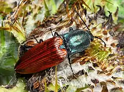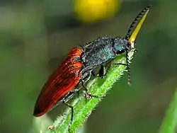 Ctenicera virens can reach a body length of about 15–21 mm (0.59–0.83 in).[4] These large and colorful click beetles have yellowish or reddish-brown elytra. They can be monochrome or with a green-bronzed marking just before the extremity. The head and the pronotum are brilliant metallic green. Pronotum is rather dotted on the sides. The males have strongly combed antennas, while the females show saw-toothed antennas from the third article onwards.[1]