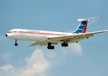 By March 1953, the carrier's fleet consisted of DC-3s and DC-4s.[12] A year later, the strength of the fleet was 11 —six DC-3s, three Lockheed Constellations, one C-46 and one Stinson— while two Super Constellations were on order.[13] Upon delivery of the first of these aircraft, in late 1954, the airline deployed it on the Mexico City–Madrid route.[14] Cubana transported more than 227,000 passenger in 1955, and by that year end it had 715 employees.[9] In May 1957, the airline ordered two Bristol Britannia 318s, intended to serve New York and Spain.[15][16][17] An order for another two aircraft of the type was placed in mid-1958; the combined deal was worth US$14 million.[15] Aimed at replacing the Douglas DC-7s on the Havana–New York route,[18] Cubana received the first of these aircraft in December 1958;[6] it was put in service on that route immediately after being phased in.[19]