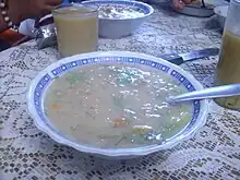 Cuchuco is a soup, part of Native American cuisine of South America associated with the Muisca people, made with corn, barley or wheat and mashed beans, popular in Colombian cuisine, especially Altiplano of the Boyacá and Cundinamarca Departments of Colombia.[1] It is a staple food in Colombia, where it is often made with peas, potatoes, wheat and beans.[2]