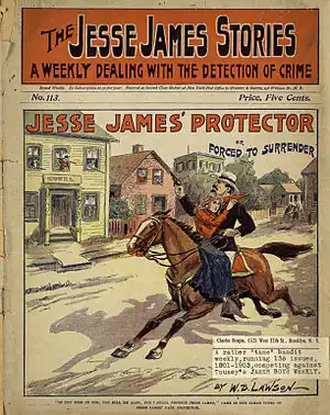 Cultural depictions of Jesse James appear in various types of media, including literature, video games, comics, music, stage productions, films, television, and radio. James is variously described as an American outlaw, bank and train robber, guerrilla, and leader of the James–Younger Gang. After the American civil war, as members of various gangs of outlaws, Jesse and Frank James robbed banks, stagecoaches, and trains across the Midwest, gaining national fame and even sympathy despite their crimes.[1] James became an iconic figure from the era, and his life has been dramatized and memorialized numerous times.[2]