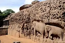 Indian rock reliefs include a number of depictions of elephants, notably the Descent of the Ganges at Mahabalipuram, a large 7th-century Hindu scene with many figures that uses the form of the rock to shape the image.[22] At Unakoti, Tripura there is an 11th-century group of reliefs related to Shiva, including several elephants.