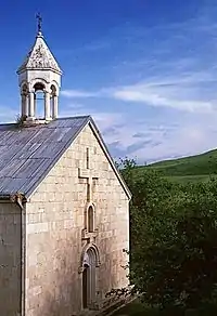 A number of Christian monuments that are identified with that vital period of the Armenian history belong to the world's oldest places of Christian worship. Among them is the Amaras Monastery (Armenian: Ամարասի Վանք), which, according to ancient authors, such as the forefather of Armenian history Movses Khorenatsi (approx.410–490), was founded in the 4th century AD by St. Gregory himself.[19] The oldest part of the monastery is the martyrium of St. Grigoris (Armenian: Սբ. Գրիգորիս), St. Gregory's grandson and Bishop of Aghvank, who was killed by the pagans, around 338 AD, when teaching Gospel in the land of the Mazkuts (present-day Republic of Dagestan, in Russia).[20] The mausoleum of St. Grigoris is a vaulted burial chamber equipped with two lateral vestibules that serves as the crypt for a church dating from a later period.[21] Amaras is an active monastery of the Armenian Apostolic Church.