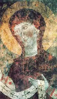 The fresco on the southern wall shows the Holy Virgin in a long robe with a red kerchief tied around her head. She is holding an oration adorned with crosses. Another fresco portrays the Christ, as he is giving the Gospel to St. Nicholas. The fresco on the northern wall represents the birth of Jesus: St. Joseph stands at St. Mary's bedside, and the three magicians kneel in adoration in front; cherubs fly in the sky above them, singing Glory in Highest Heaven.[83] A native of Artsakh and the 13th century author Kirakos Gandzaketsi (Armenian: Կիրակոս Գանձակեցի) hints in his "History of Armenia" that Queen Arzou (Armenian: Առզու Թագուհի) and her daughters were gifted with exceptional artistic talent, so it has been theorized that they could have been among those who helped paint the murals.[84] Other than at Dadivank, Some other frescoes are found in the main parish church of the town of Arajadzor in Mardakert District.