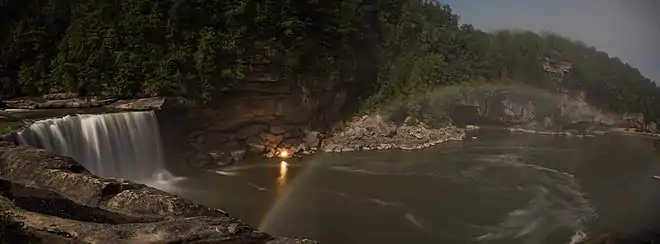 During or near a full moon on clear nights, a lunar rainbow or moonbow is sometimes formed by the water of the falls.[3][10]: 44 The formation of a moonbow at Cumberland Falls is aided by a combination of steep gorge walls, which reduce dissipation of the waterfall's mist by wind, and a wide gorge which allows increased levels of moonlight.[11]