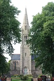 On the Bonnygate, the Category A-listed[26] Preston Lodge built by the Laird of Airdrie is the town's second oldest building.[7][27] The house was built in 1623 and is inscribed on a stone on the west wall. The house was extended in 1702 by James Preston and was remodeled by London goldsmith William Preston, in 1765. Later, the Reverend Sir James Preston occupied the house between 1775 and 1791, when he was the minister of the Cupar Old Parish Church.[27] The original design of the building is believed to have been inspired by Culross Palace in Culross.[7] Situated at the corner of the Crossgate, the Category C[28] listed Duncan's Institute by John Milne, which was built 1870–71[29] as a mechanics' institute for the "working classes of Cupar" by Mrs Duncan. The building, a mixture of Gothic, Scottish and Flemish styles is recognised in the town for its twisted spire. On the Kirkgate is the Parish Church of Cupar Old and St Michael of Tarvit, designed by the architect, Hay Bell.[7] This consists of the Category A-listed[30] Parish Church tower dating from 1415 and the Category B-listed main church building from 1745.[7] The tower is the only surviving piece of the old Cupar parish church, founded by the priory of St Andrews.[7][31]