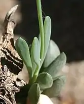 A small, low-growing succulent, with rhizomes and a few short, erect stems, with the leaves concentrated at the tip of top of each stem. The leaves are blue-green, pruinose, and typically flattened laterally. Each side of the leaf blade has several translucent lines.