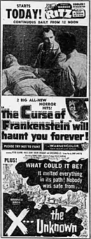 The Curse of Frankenstein premiered in London on 2 May 1957 at Warner Theatre in Leicester Square.[14] It received a general release in the United Kingdom on 20 May 1957 where it was distributed by Warner Brothers and supported by the film Woman of Rome.[14] The film was reissued in the United Kingdom in the late 1960s where it was distributed by Rank/Universal International where it was a double feature with The Mummy.[14] In the US the film was released by Warner Bros on 20 July 1957 with X the Unknown as supporting feature.[14] It was reissued in the United States on 16 December 1964, when it was released with Dracula (1958).[14]