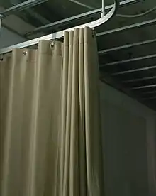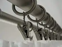 A curtain rod, curtain rail, curtain pole, or traverse rod is a device used to suspend curtains, usually above windows or along the edges of showers or bathtubs, though also wherever curtains might be used. When found in bathrooms, curtain rods tend to be telescopic and self-fixing, while curtain rods in other areas of the home are often affixed with decorative brackets or finial. Special poles can be made for bay windows or made by joining a number of straight and corner bends to fit the shape of a bay window.