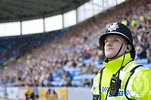 The standard equivalent for female officers is a "bowler" hat. This is shorter, chequered around the rim, and structurally reinforced to equal the custodian's protection. Uniquely, Staffordshire Police issues custodian helmets to all female constables for level 2 public order duties (and level 3 when requested).[12] Numerous other forces - including Essex Police and the British Transport Police - also allow their female officers to wear custodians if preferred.[13][14]