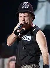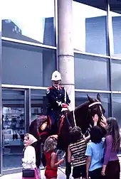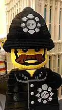 A cultural icon, the custodian helmet has featured in films, TV series and other media involving British police.[2] Often playing minor characters, in the UK they have appeared in kids shows such as Thomas the Tank Engine & Friends and Fireman Sam, television comedy shows such as The Benny Hill Show and Monty Python's Flying Circus (the latter including "The Funniest Joke in the World" sketch), and critically acclaimed films including The Ladykillers (1955), Hot Fuzz (2007) and Paddington (2014).[27][28][29][30] Appearing as minor characters in international media (such as Mary Poppins (1964) and Sherlock Holmes (2009)), constables on foot patrol wearing their custodian helmet have also appeared in the background of shots to indicate a traditional British setting (much like other features unique to a British street such as the red telephone box, the red double-decker bus or a black taxi which have been used as an establishing shot for London).[31][32][33][34] Dressed as a constable when introducing Queen on stage at Live Aid in 1985, comedian Mel Smith undoes the chin strap before removing his helmet and shouting into the mic, "her majesty, Queen!"[35]