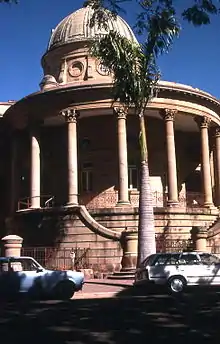 Projecting from the hipped, corrugated iron roof, centrally over the principal room of the building is a large dome clad with a copper and zinc alloy, known as Muntz metal sheeting. The metal sheets have been laid radiating from the central metal lantern in twelve sections with border mouldings which define the sections. The dome rests on a substantial sandstone drum which is pierced with twelve regularly spaced oculi or round windows, every second and third ones of which are blind openings. These are divided by slender pilasters which expand outward toward their base to form buttressing elements. The pilasters seem to support an entablature which surrounds the crown of the drum.[1]