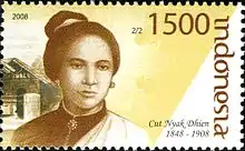 Cut Nyak Dhien or Tjoet Nja' Dhien (c. 1848 – 6 November 1908)[1] was a leader of the Acehnese guerrilla forces during the Aceh War. Following the death of her husband Teuku Umar, she led guerrilla actions against the Dutch for 25 years. She was posthumously awarded the title of National Hero of Indonesia on 2 May 1964 by the Indonesian government.[2]