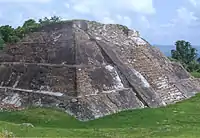 At the top of this structure, a two-meter-high (6.6 ft) monolith was found; it has evidence of having been re-modeled in three occasions; the last one, with Aztec influence occurred in 1400 CE.[1]
