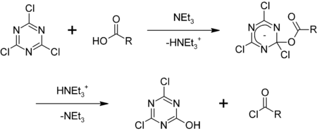 - ↑ K. Venkataraman & D. R. Wagle (1979). "Cyanuric chloride : a useful reagent for converting carboxylic acids into chlorides, esters, amides and peptides". Tetrahedron Lett. 20 (32): 3037–3040. doi:10.1016/S0040-4039(00)71006-9.