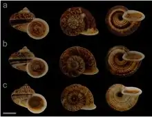 | Specimens of Cyclophorus phongnhakebangensis (a: holotype, b and c: paratypes; scale bar: 10 mm | |
