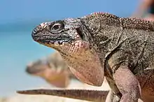 In the early 1900s the population was almost wiped out, but had increased to some 150 iguanas by 1970 on the only two islands were it bred. In 1982, this had increased to a bit over 200 animals. In the early 1980s the population was growing at some 20% annually, and it had recovered by the end of the century to the limit of the carrying capacity of its original islands.[1] In 2000, it was estimated that the current global population was less than 1,000 and it was said to be declining,[6] although it was actually increasing. In 2018 the population was assessed to be 482–632 (mature adult) individuals, with 482 being the amount of mature adult iguanas on U and Leaf Cay in 2016 based on recapture counts. This number does not include over 150 adult iguanas found on islands where it believed they cannot breed.[1] The population on Allen's Cay was at 20–25 for a number of decades according to Iverson, but it was reduced to ten individuals in 2013 indirectly due to bird conservation activities.[7][10] In the 1990s, a number of iguanas were moved to nearby islands.[1] Iverson and P. Hall, a warden of Exumas Cays Land and Sea Park, moved only eight sub-adults to Alligator Cay between 1988 and 1990, of which at least seven had survived ten years later, and these had increased to between 75 and 90 individuals in 1999 based on recapture analysis of 28 caught and tagged iguanas during four visits. Mostly larger lizards were caught and it was expected there were many more juveniles, and the island had not reached carrying capacity.[11][13] According to the IUCN the population declined over the next decade due to hurricane damage of the vegetation and emigration to the nearby island of Narrow Water Cay. Hines reported seeing 28 iguanas on Alligator Cay and an estimated 38 iguanas on Narrow Water Cay in 2013, and found that apparently some iguanas had successfully emigrated to nearby Warderick Wells Cay. The Flat Rock Reef Cay population appeared in the mid-1990s, the IUCN claims it was purposely introduced without authorisation by unknown people. It rapidly increased to around 200 individuals by 2012, although the IUCN claimed in 2018 that the island would not sustain this population due to its low carrying capacity.[1]
