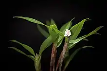 These herbs are epiphytic, but also rarely terrestrial.[2] The elongate stems are slender and usually not pseudobulbous (though some species do possess a few terminal internodes, sometimes slightly swollen), with leaves along the entire length, except for some nodes at the base where persistent leaf sheaths have formed, or with some leaves towards the end/apex. The leathery leaves are alternate, conduplicate, and their shape can be linear-oblanceolate, or either narrowly elliptic or ovate. The leaves articulate to a sheathing base that tightly envelopes the stem. The usually short or slender inflorescences occur either laterally on many nodes or come from the terminal node of the stem, and have only 1 or 2-3 flowers. The peduncle is usually very much reduced. The few floral bracts are spirally arranged (in a few species they are conspicuous, brightly coloured and fleshy). The flowers are mostly coloured white or cream, though some species have ochre-yellow flowers. Flowers are medium-sized, glabrous (smooth) or with sparse stellate-hairs on the abaxial surface to the sepals. Pedicel and ovary are glabrous. Sepals vary, dorsally they are free, often recurved, while the lateral sepals are oblique at the base, forming with column foot a blunt oblique mentum. The petals are free and small than the sepals, their curved lip is three-lobed, hinged to a column foot, and adorned with a papillose, subglobose callus and either papillose keels or laminate keels. The lateral lobes are erect, and enclose the column. In most species the mid-lobe is smaller than lateral-lobes. The short column has a foot shorter than or about as long as the column proper. There are 8 rectangular pollinia, arranged in pair-series, a large and a small in each pair, with the posterior 4 are much smaller.