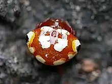 The female is 5–7 mm long. The carapace is wider than long and light reddish brown. The sternum is also reddish brown, whereas the legs are yellowish brown. The abdomen is broad, wider than long, and is reddish with six main pairs of white markings. The pair in the middle of the side of the abdomen have a dark central mark and resemble eyeballs. The underside of the abdomen is red. The epigyne has no scape. The male is smaller, 1.5–2 mm long. It is darker than the female and lacks the abdominal pattern. The median apophysis of the palpal bulb is curved and has a pointed tip.[3]