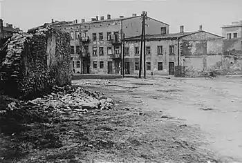 ![]() Shelled Warsaw Square in Częstochowa circa 1944 after the Częstochowa Ghetto uprising, renamed as Ghetto Heroes Square after the war | |