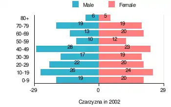 According to the 2002 Poland census, there were 322 people residing in Czarzyzna village, of whom 49.7% were male and 50.3% were female. In the village, the population was spread out, with 24.8% under the age of 18, 36.6% from 18 to 44, 15.2% from 45 to 64, and 23.3% who were 65 years of age or older.[1]