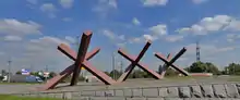 In early 2022, during the Russian invasion of Ukraine, hedgehogs were used in conjunction with concrete barriers and other techniques to thwart Russian forces.[2] The Ukrainian Railways repurposed new tracks to make hundreds of hedgehogs at 33 of its own shops and some other sites. The railroad estimated they had enough material for some 1800 hedgehogs.[3][4] The Ukrainian military in Odesa,[5] Kyiv[6][7] and Lviv[8] also made hedgehogs to be distributed to strategic locations. In Kyiv, hedgehogs from WWII were brought out of a museum and used at a roadblock.[9]