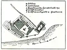 The castle complex was founded as a County castle before the year 1260. The origins of the castle date back to the time when Adolf VIII of Berg, together with John I, Duke of Brabant and the counts of Jülich and Eberhard finally ended the rule of the Cologne Archbishop in the Battle of Worringen in 1288. The preserved round tower still dates from the 13th century.[3] The elevation of William II to the Reichsfürstenstand entailed a planned spatial arrangement of the Düsseldorf residence. In 1382, the forerunner of a Bergisch chancellery ("schrijfcamer") existed at the castle. Construction work on a princely chapel is vouched for in 1382, which was cited as the "castle chapel" in a document dated 12 July 1392 of the Archbishop of Cologne Friedrich III.[4][5] Further building measures took place around 1384. A three-winged castle complex was built, which occupied approximately the area of today's Burgplatz. The construction took place as part of a town expansion plan. In 1399, two chapels are already present; in the smaller one ("capella minor"), Duke Wilhelm took the promised oath of fealty to the English King Richard II in the presence of the English envoy Johann de Palacio on 23 April 1399.[6] In 1435, a "Burghgrave" is mentioned. In 1492 the castle burned for the first time, after which increased building activity is noted. At the end of the 15th century, the castle was extended, the square south-east tower was built, which dominated the Mühlen- and Kurzestraße, as well as the market and castle square. The material used for the castle was sandstone ashlars mixed with trachyte. Later reinforcements were worked in brick masonry.[3]