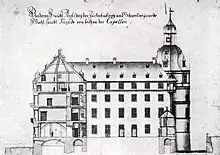 On the occasion of his marriage to Jakobea of Baden in 1585, Frans Hogenberg created various copperplate engravings depicting the architecture of the residential palace: