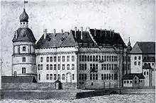 The renovation work was also directed at the interior; Jan Wellem made use of Italian architects, in particular Domenico Martinelli, who had initially designed a large rectangular four-wing complex with symmetrical Baroque façades and sequences of rooms, incorporating foundation walls from the old palace. Due to a lack of funds, however, this design was not realised; instead, the old palace was lavishly modernised.[9] However, the baroque court also demanded more space. Thus a bakehouse, a brewery, a stable and a riding school were built, as well as a theatre, a ballroom and a page house. The large banqueting hall with windows overlooking the Rhine was built in the wing facing the Rhine. The banquets and balls on the occasion of the wedding of John William, the son of Wilhelm , to Jakobea of Baden had taken place in this hall. The hall had a "very powerful beamed ceiling and huge tapestries".[7] An illustration has been preserved in Dietrich Graminäus' book of memories. In 1654, Duke Philip William received the English King Karl II at the castle. In 1697, another important wedding celebration took place in the castle: The homosexual Gian Gastone de' Medici, alongside his equally homosexual brother Ferdinando the last male representative of the Grand Ducal House of Medici, married Anna Maria Franziska of Saxe-Lauenburg, from whom he soon separated childless, condemning this dynasty to extinction. During the War of the Spanish Succession, in October 1703, Arch Duke Charles, later Roman-German Emperor Charles VI, who had been proclaimed King of Spain, paid a visit to the electoral couple in the castle. Also John Churchill, who was involved in the war at that time, stayed in Düsseldorf during these days.[10] Because of the Conquest of Electoral Cologne Kaiserswerth in 1702, the English Queen Anne had elevated him to the first Duke of Marlborough. Between 1709 and 1712, according to plans by Matteo Alberti, the first independent gallery building Gemäldegalerie Düsseldorf was added to the palace.