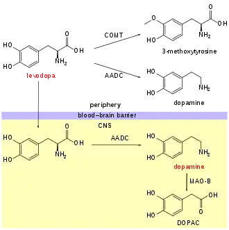 Peripherally selective DDCIs incapable of crossing the protective blood–brain barrier (BBB) are used in augmentation of L-DOPA (levodopa) in the treatment of Parkinson's disease (PD) to block the conversion of L-DOPA into dopamine outside the brain, for the purpose of reducing adverse side effects.[3] Combined L-DOPA and DDCI therapy does not inherently decrease peripheral cardiovascular side effects of L-DOPA administration; however, combined therapy potentiates the central effects of L-DOPA by decreasing the dose-dependency 4-5 fold, therein allowing for effective Parkinson's disease treatment without cardiovascular risk associated with high peripheral dopamine.[4][5]