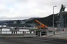 The Northern Ammunition Jetty (also known as Glen Mallan Jetty) is located on the edge of Loch Long, around 3 miles south of the main depot, to which it is connected by a military road which climbs along the western flank of Craggan Hill.[7] The jetty is capable of accommodating a variety of Royal Navy and Royal Fleet Auxiliary vessels so that they can be loaded and unloaded with munitions as well as other provisions such as food and spare parts. The explosives license for the jetty allows up to 440 tonnes of explosives to be handled there.[3] In 2020-21 the jetty was rebuilt to serve the Queen Elizabeth-class aircraft carriers.[8]
