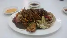 Pepper and salt fried food served with chili is also popular. Chefs will first fry the particular food (usually a light food like tofu or squid) and then re-fry it with pepper and salt.